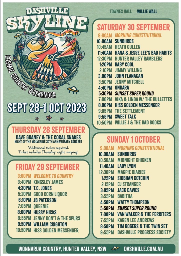 One of the alt-country, Americana, folk, blues and rock ‘n’ roll highlights on the calendar each year is Dashville Skyline. The festival is held yearly in the Hunter Valley/Wonnarua Country region of NSW over the October long weekend.