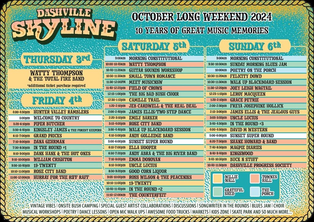 So… ten years! From humble beginnings and a plan to celebrate cosmic country, folk music, blues and rock ’n’ roll, the festival continues to prove itself as the perfect blend of adventure, heartfelt optimism, love, respect, good vibes and brilliant music. They celebrate the trailblazers (Slim Dusty, Archie Roach etc) raise up the newcomers just starting to build their audience and inject the perfect amount of high quality international talent into the mix. As other festivals sadly stumble and struggle, Skyline continues to gather its people and protect and enhance its inherent musical and moral values.